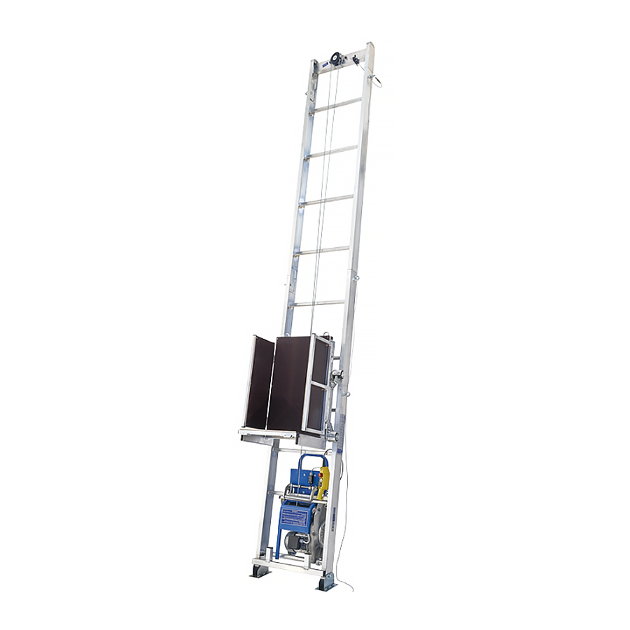 L'elevatore Lift 2000 consente il sollevamento di materiali mediante l’utilizzo di un apposito carrello elevatore trainato da un cavo in acciaio su struttura modulare in alluminio con elementi di diversa lunghezza.