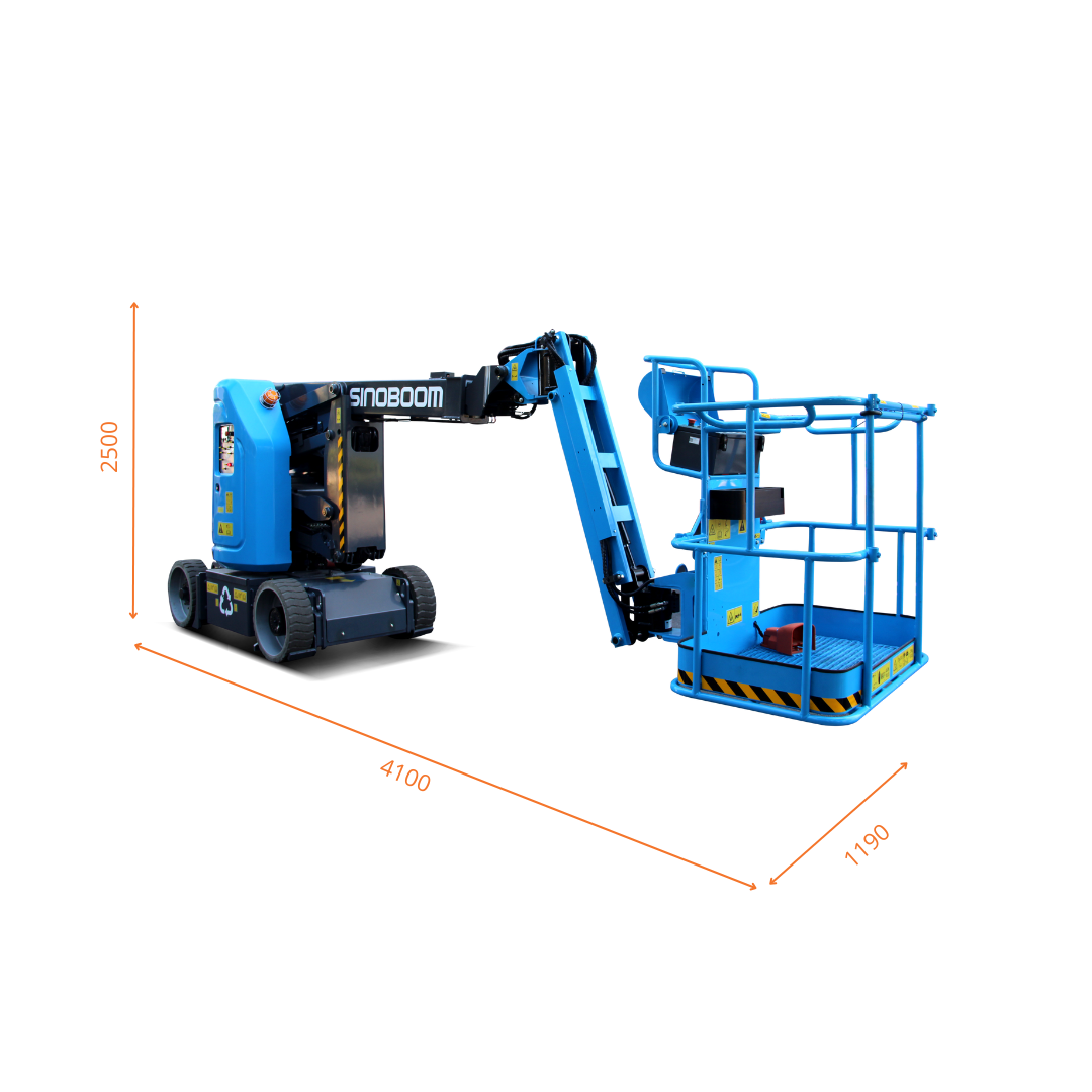 Il sollevatore snodato semovente Sinoboom AB10ERJN è in grado di raggiungere un’altezza massima di lavoro di 11,62 metri, una portata massima di 230 kg e uno sbraccio laterale di 6,3 metri.